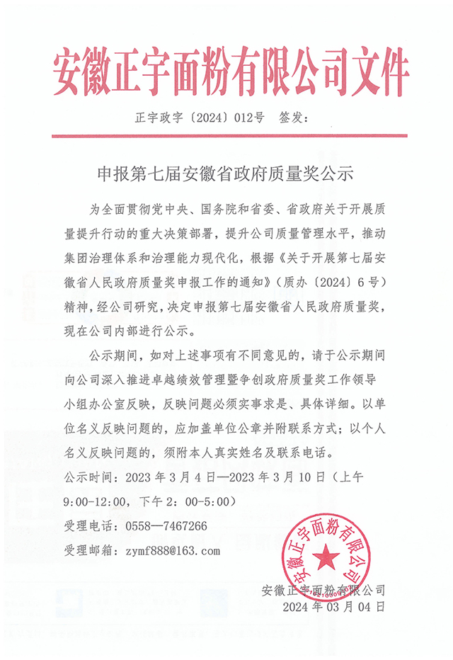 為全面貫徹黨中央、國(guó)務(wù)院和省委、省政府關(guān)于開展質(zhì)量提升行動(dòng)的重大決策部署,提升公司質(zhì)量管理水平,推動(dòng)集團(tuán)治理體系和治理能力現(xiàn)代化,根據(jù)《關(guān)于開展第七屆安徽省人民政府質(zhì)量獎(jiǎng)申報(bào)工作的通知》(質(zhì)辦(2024)6號(hào))精神,經(jīng)公司研究,決定申報(bào)第七屆安徽省人民政府質(zhì)量獎(jiǎng)現(xiàn)在公司內(nèi)部進(jìn)行公示。